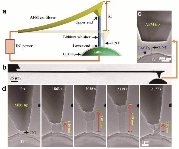 Researchers have combined atomic force microscopy (AFM) and environmental transmission electron microscopy (ETEM) to achieve the accurate measurement of in-situ nano-scale lithium dendrite growth, its mechanical properties, and force-electric coupling. It is found that the stress that can be generated during the growth of lithium dendrites is as high as 130 MPa. Through in-situ compression experiments, it is found that the yield strength of lithium dendrites is as high as 244 MPa, which is much higher than the yield strength of macro-metal lithium (~ 1 MPa).