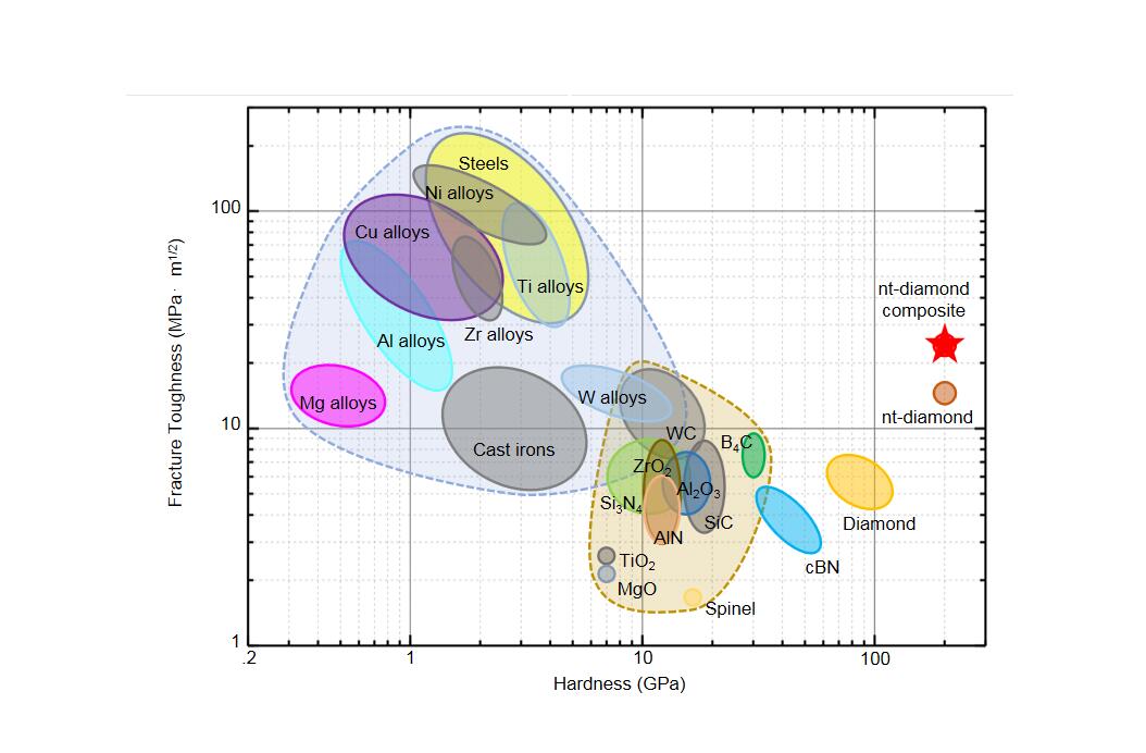 YSU, Beihang University and other institutes proposed a new idea to toughen diamond. The team reported the structural characterization of a diamond composite hierarchically assembled with diamond polytypes, interwoven nanotwins and interlocked nanograins. Through nanotwinning, laminated composite toughening and transformation toughening, the architecture of the composite enhances the toughness of diamond to 26.6 MPam0.5, a toughness up to five times that of synthetic diamond10, even greater than that of magnesium alloys, and equivalent to that of aluminum alloys, while maintaining the Vickers hardness of 200GPa.