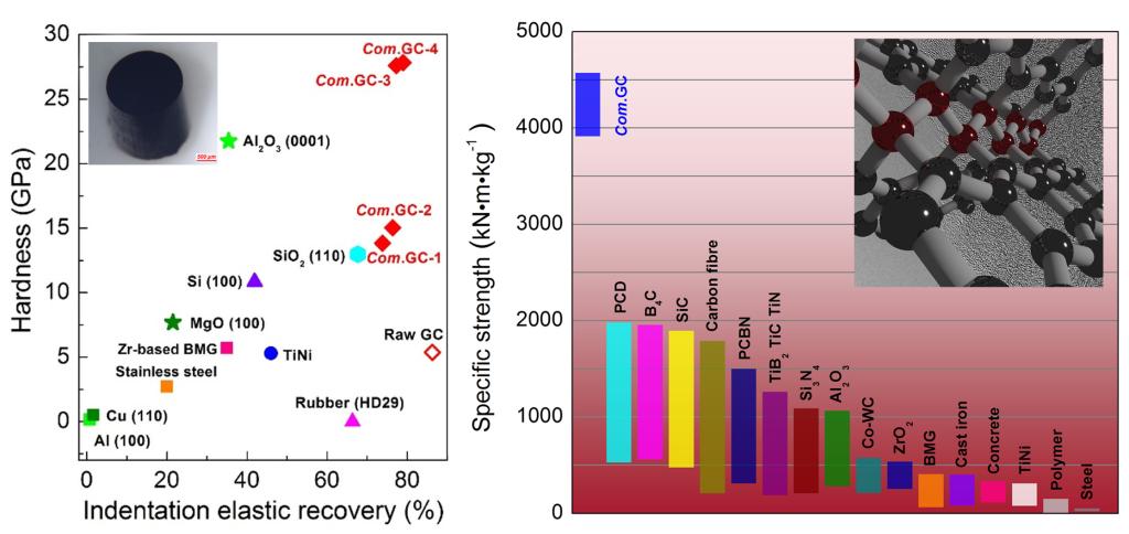 Compressed GC, with the bonding features of both graphene and diamond, is a class of new carbon material mixed sp2and sp3. The disordered multilayer graphene in GC curves, bonds and crosslinks together by many means forming a spatial structure with long-range disorder and short-range order. This class of carbon material exhibits extraordinary property combinations with close density and electrical conductivity to graphite, obviously higher compressive strength than common metals and ceramics and even twice higher than commonly used carbon fibers, cemented diamond, silicon carbide and boron carbide ceramics. Its hardness can be compared fairly with gems, thus making it scratch on silicon carbide single crystal. The compressed GC has remarkable above 70% elastic recoveries, also obviously higher than common metals and ceramics, and even higher than the shape-memory TiNi alloy and organic rubber. This class of compressed GC combines a variety of features into one material, including low weight, extraordinary specific compressive strength, high hardness, indentation elastic recovery, and sound electrical conductivity, which has potential applications in military and aerospace fields.