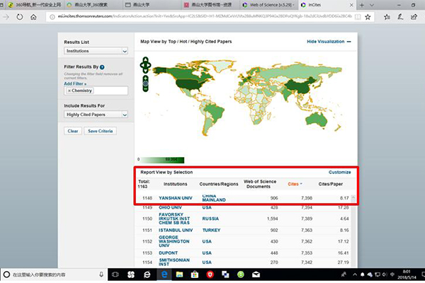 Since 2008, YSU has successively launched engineering upgrading project, science rising project, and first-class discipline construction project. The strategy of strengthening YSU through human resource development has been implemented by introducing policies to encourage the publication of high-level papers, which significantly improved the quality and international influence of the papers. According to the latest ESI data, YSU teachers and students have published 906 ESI papers in the field of chemistry since 2008.The total citations reached 7,398 times, and average citations 8.17 times, and there are 9 highly cited papers and 1 hot paper of ESI, which enabled YSU Chemistry discipline to rank the top 1% in the world.