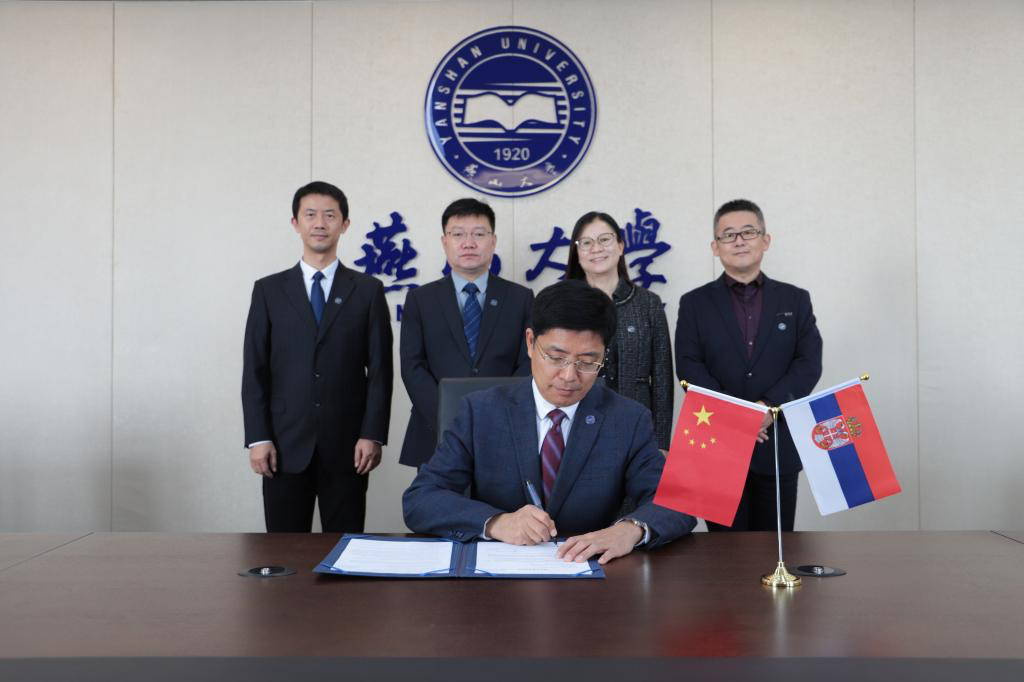 Professor Simo Djordjevski, Principal of Smederevo Vocational High School, Professor Dejan Vemic Zamenik, Vice Principal of Smederevo Vocational High School, Srdjan Stefanovic, Secretary General of Smederevo municipal government, and Wang Wenmin, project officer of the China-Europe Silk Road Cultural Exchange and Cooperation Association participated in the signing ceremony at the Serbian venue; while Zhao Dingxuan, President of Yanshan University, Chen Guoqiang, Vice President of Yanshan University, and other officials from the School of International Education participated in the signing ceremony at the Yanshan University venue.