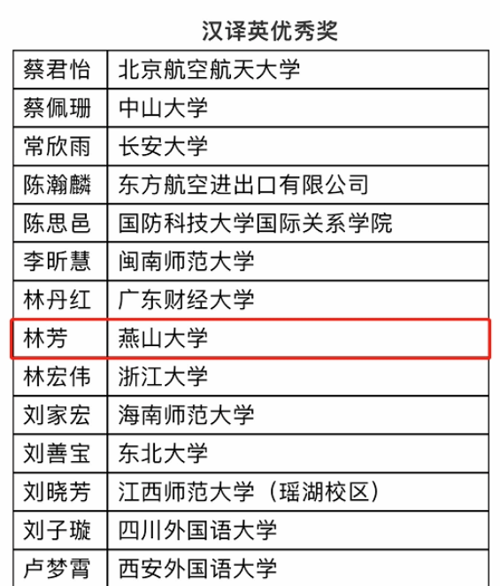 According to the result released by the 33rd Han Suyin International Translation Contest on October 21, Lin Fang, a postgraduate student of English Translation from class of 2022 at the School of Foreign Studies (SFS), Yanshan University (YSU), won the excellent prize.