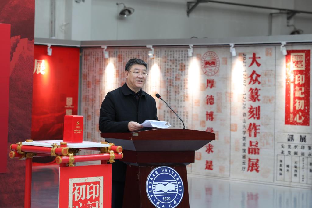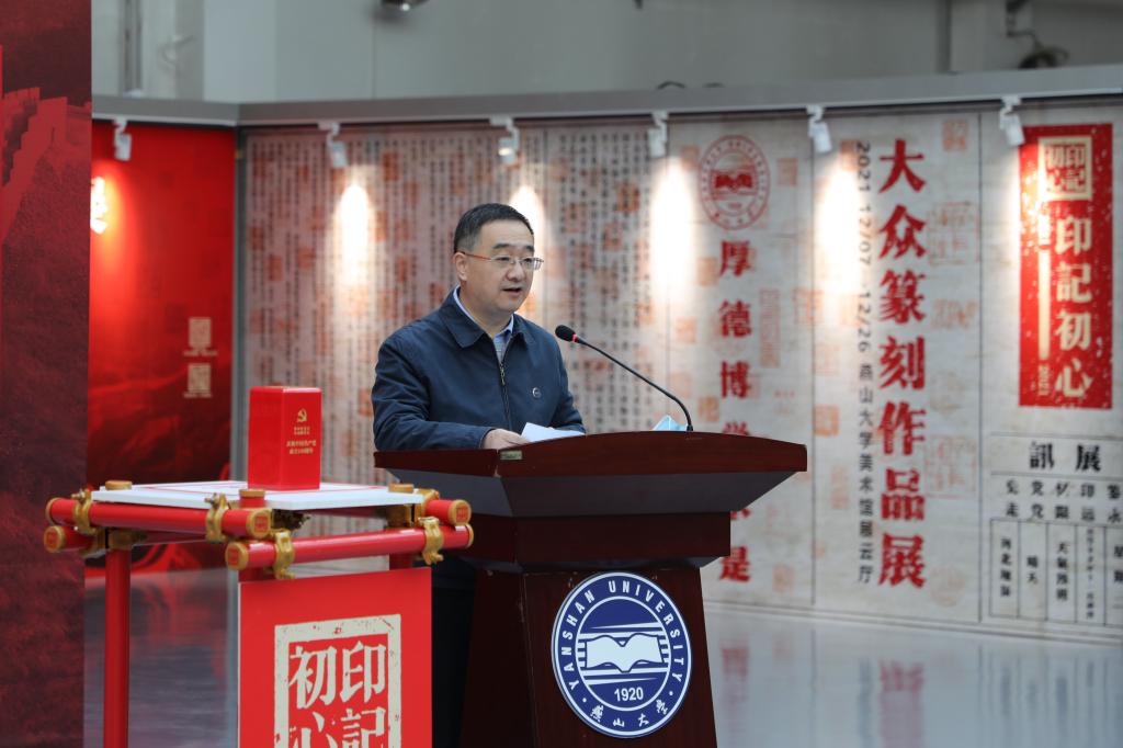 On behalf of YSU, Huang Sheng expressed welcome and gratitude to the leaders and guests who attended the opening ceremony, and introduced the development history of YSU and the development of YSU’s seal carving art to the guests. Huang Sheng introduced that YSU, as one of the three national excellent traditional culture Chinese inheritance bases and the only engineering university in China with seal cutting as the inheritance project, will work hard to inherit and develop the art of Chinese seal cutting, and contribute to the promotion of excellent traditional Chinese culture. This exhibition is also the embodiment of the base's function of inheritance and promotion of traditional culture. Huang Sheng pointed out that this exhibition is not only an elegant art activity, but also an innovative form of learning and education of CPC history. He invited everyone to sustain the revolutionary legacy through the seal carving works, and gather the power of forge ahead.