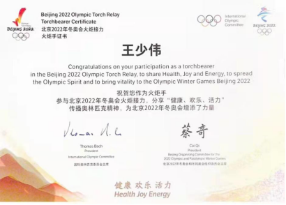 Beijing 2022 Olympic Torch Relay Torchbearer Certificate