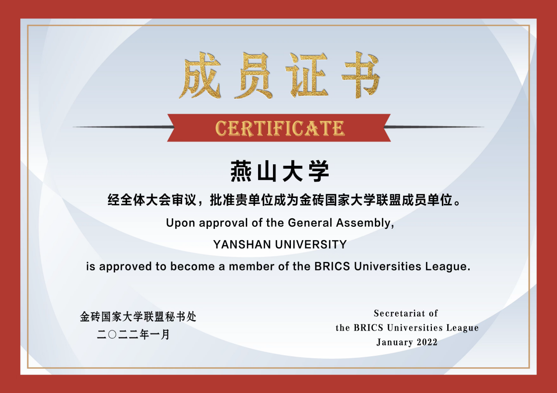 Recently, YSU received the membership certificate from the Secretariat of BRICS Universities League, and officially became a member of the league.