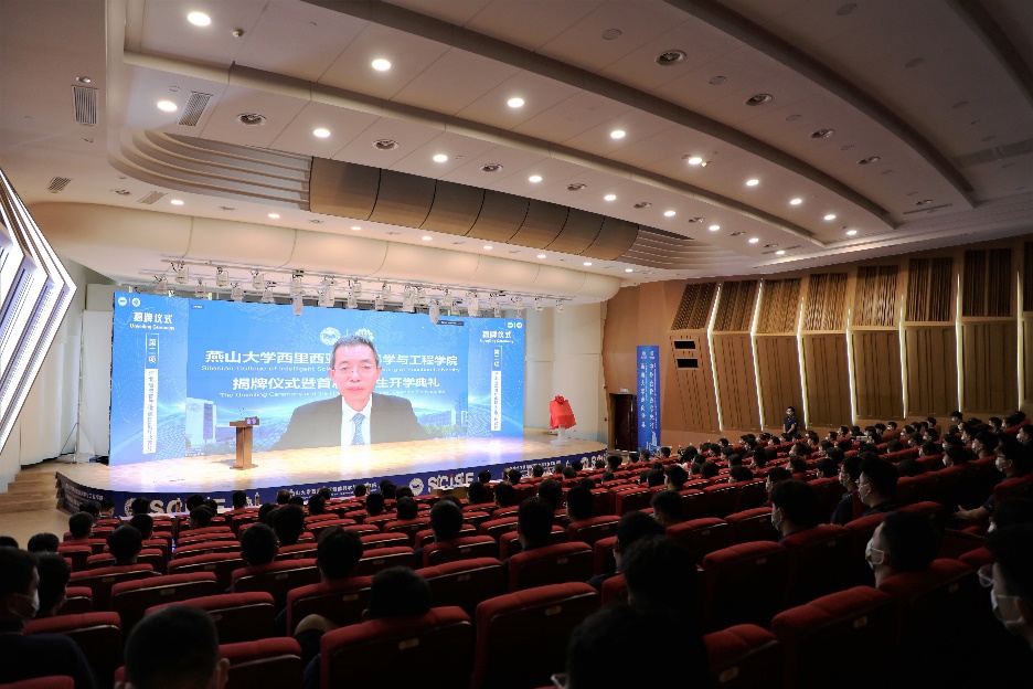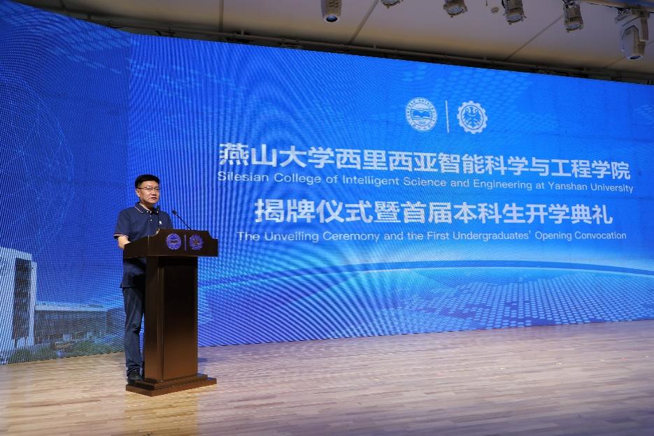 On the afternoon of September 8, the Unveiling Ceremony and the First Undergraduates’ Opening Convocation of the Silesian College of Intelligent Science and Engineering, Yanshan University were held in the Concert Hall of West Campus. Due to the epidemic, Wojciech Zajaczkowski, Polish Ambassador to China, Arkadiusz Mężyk, President of Silesian University of Technology in Poland, and Hou Jianguo, Second-level Inspector of Hebei Department of Education attended the ceremony online. Zhao Xianfeng, CPC Secretary of YSU, Zhao Dingxuan, Deputy CPC Secretary and President of YSU, Chen Guoqiang, CPC Standing Committee Member and Vice President of YSU and Dean (concurrently) of the Silesian College of Intelligent Science and Engineering, and the directors of relevant departments of YSU attended the ceremony on the site, together with representatives of faculty members and students. The event was presided over by Chen Guoqiang.