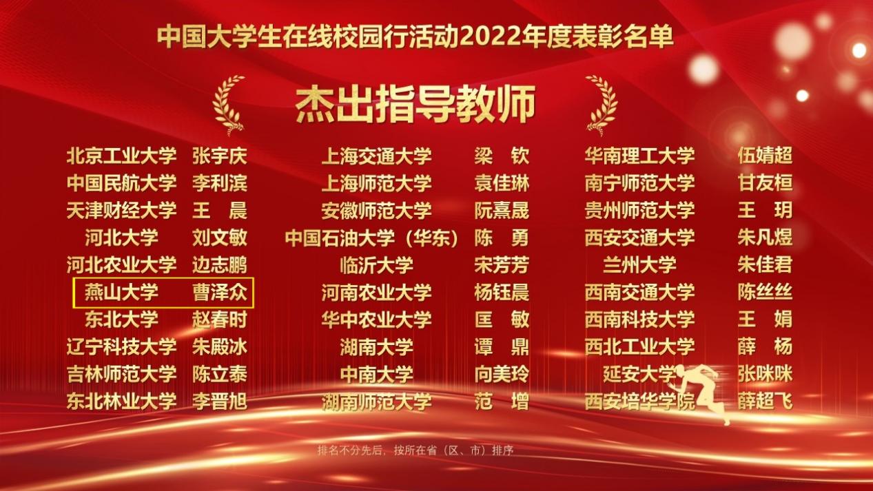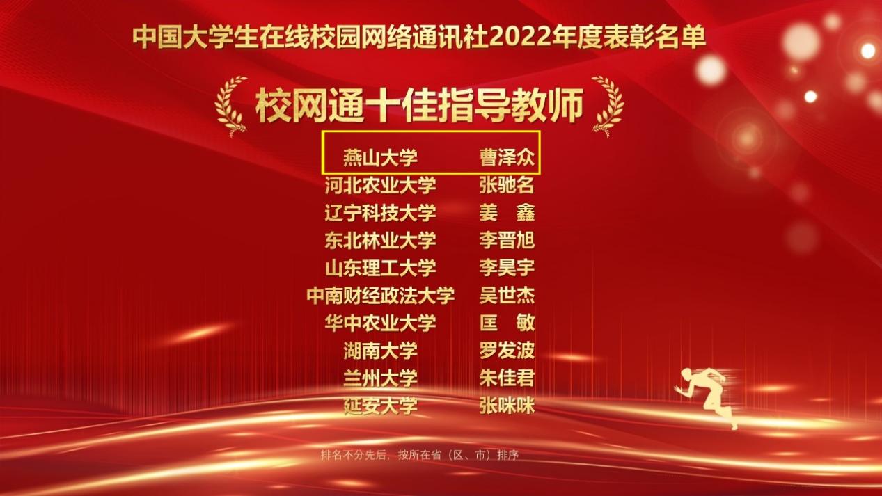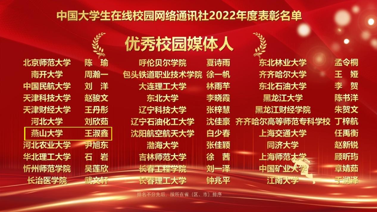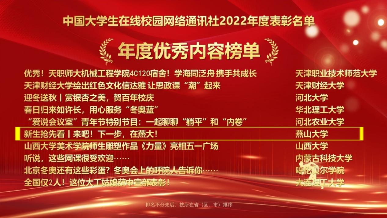 The commendation list of campus new media 2022 and the commendation list of campus network communication station and campus trip 2022 issued by dxs.moe.gov.cn were announced at the meeting. YSU was awarded the national "Top 100 for Campus New Media Interactions in 2022"; the Office of Student Affairs awarded the "Excellent Organizer" of Campus Trip in 2022; Campus Network News Agency awarded the "Top 10 Campus Network Communication Stations" in national universities; Cao Zezhong, the instructor of the Campus Network Communication Station, awarded the "Top 10 Instructors of Campus Network Communication Station" and the "Outstanding Instructor" of Campus Trip; Xu Haijiao, a member of Campus Network Communication Station, awarded "Top 10 Media People of Campus Network Communication Station"; Wang Shuxin awarded the "Excellent Campus Media People"; the network article Freshmen Take the Lead| Come on! Let’s Get Together in YSU! awarded the "Excellent Content of the Year".