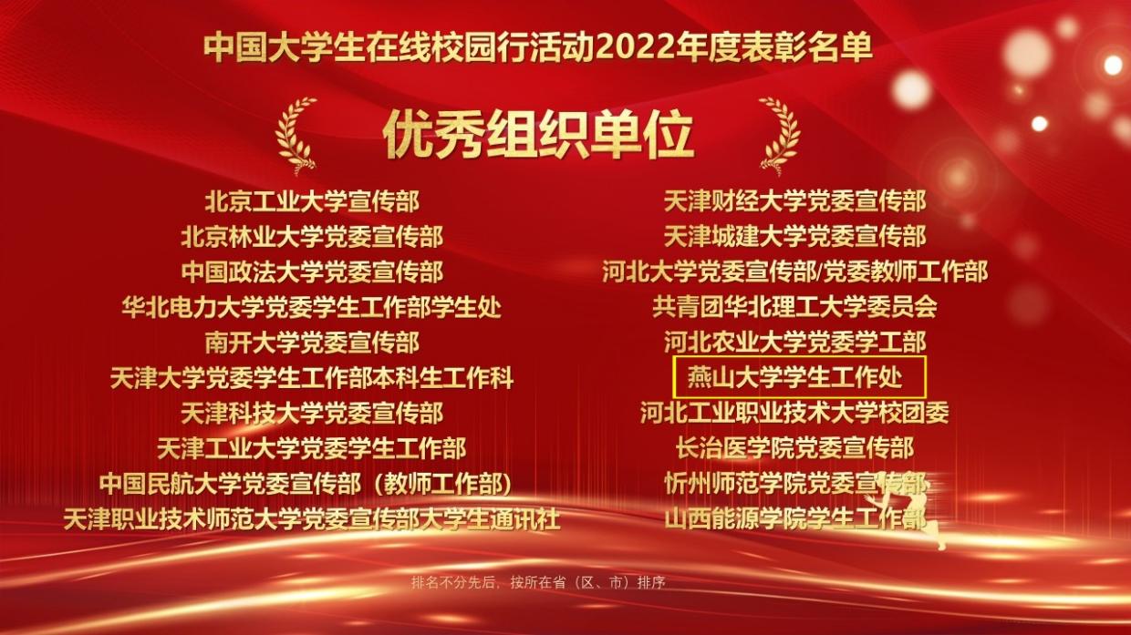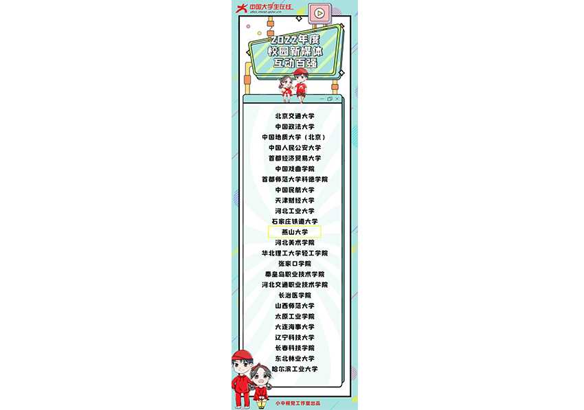 YSU has started to build an online campus account of dxs.moe.gov.cn since 2020, and has always paid attention to strengthening online cooperation with dxs.moe.gov.cn. The influence index of the campus account has long been listed in top 10 in the country. In 2022, YSU published 103 articles on dxs.moe.gov.cn through the campus account, and held nearly 20 Campus Trip activities of dxs.moe.gov.cn on the occasions of graduation season, orientation season, freshmen welcome season and other time nodes, and actively organized and participated in activities such as "Reading Youth", the 100 characteristic displays of 100 students in 100 colleges and universities nationwide. In addition, YSU has constantly explored the development law of new media and focused on the functions of thought leading, public opinion guidance and management service on media platforms such as WeChat and TikTok to vigorously promote the online ideological and political building, and has created a batch of online cultural works with ideological depth, content breadth and features of the era, and launched a batch of network articles with "timeliness, efficiency and degree".