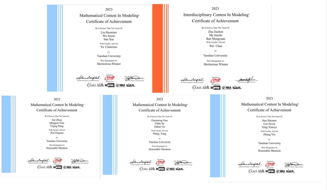 Recently, the results of all prizes of the 2023 Mathematical Contest in Modeling/Interdisciplinary Contest in Modeling (MCM/ICM) have been announced. Students from Yanshan University won 2 Meritorious Winner prizes and 3 Honorable Mention prizes.
