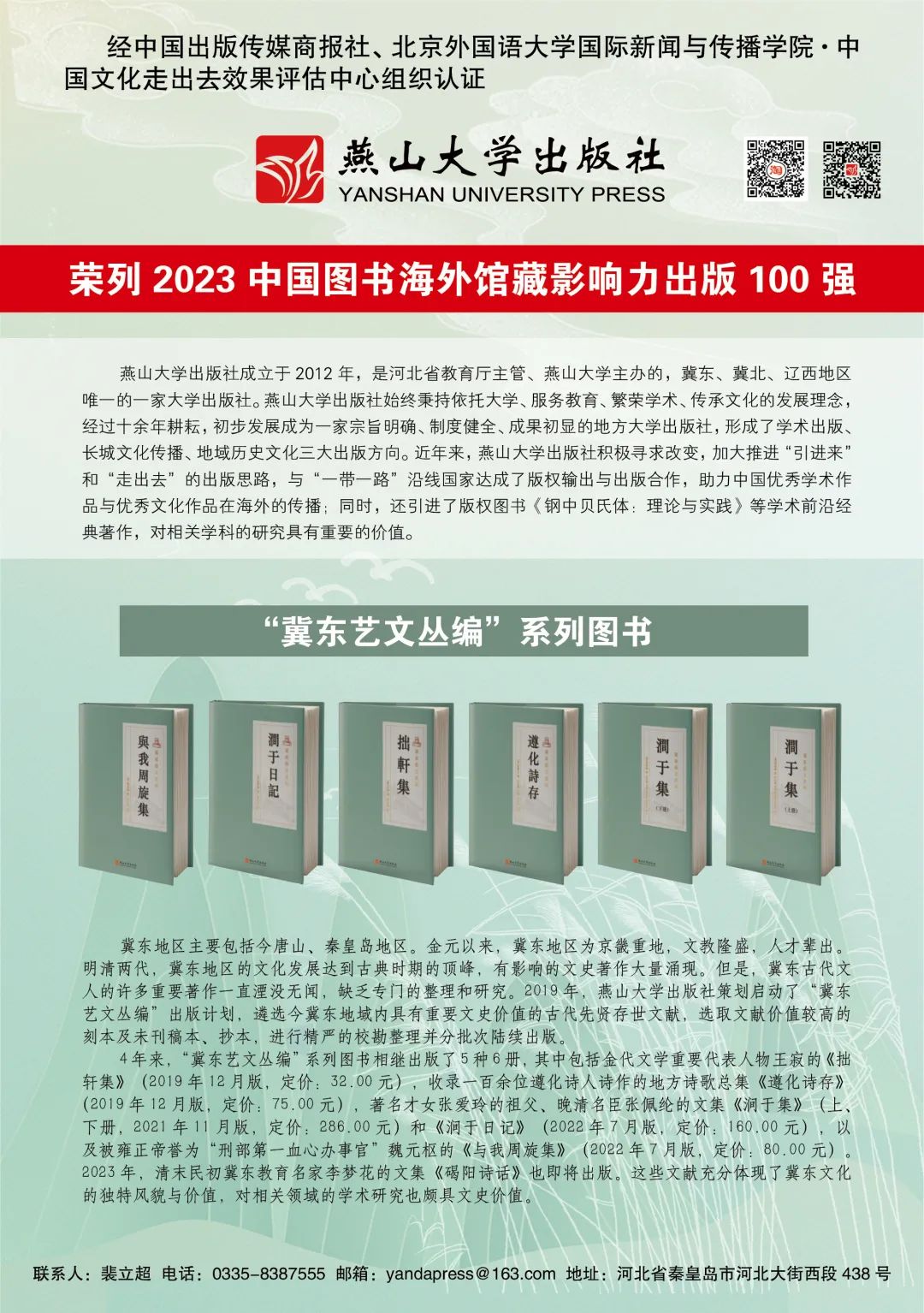 In recent years, Yanshan University Press has actively dedicated itself to telling the Chinese story and has intensified efforts to promote the publishing approach of “bringing in” and “going out.” It has established copyright exports and publishing cooperation with countries participating in the “Belt and Road” initiative. This has helped facilitate the dissemination of outstanding Chinese academic and cultural works overseas. Furthermore, Yanshan University Press has also introduced significant academic and cutting-edge classic works that hold valuable importance in domestic research disciplines, such as “Bainite in Steels: Theory and Practice”. Being selected as one of the “Top 100 Publishers with Overseas Library Collection Influence in China” for two consecutive years demonstrates that Yanshan University Press' published books have gained recognition and appreciation from readers both at home and abroad, indicating their intellectual value and academic standards. In the future, Yanshan University Press will further enhance the quality of its books, focusing on exploring and promoting outstanding traditional culture. It will strive to create more high-quality publications and continuously explore feasible pathways for the overseas dissemination of excellent Chinese culture.