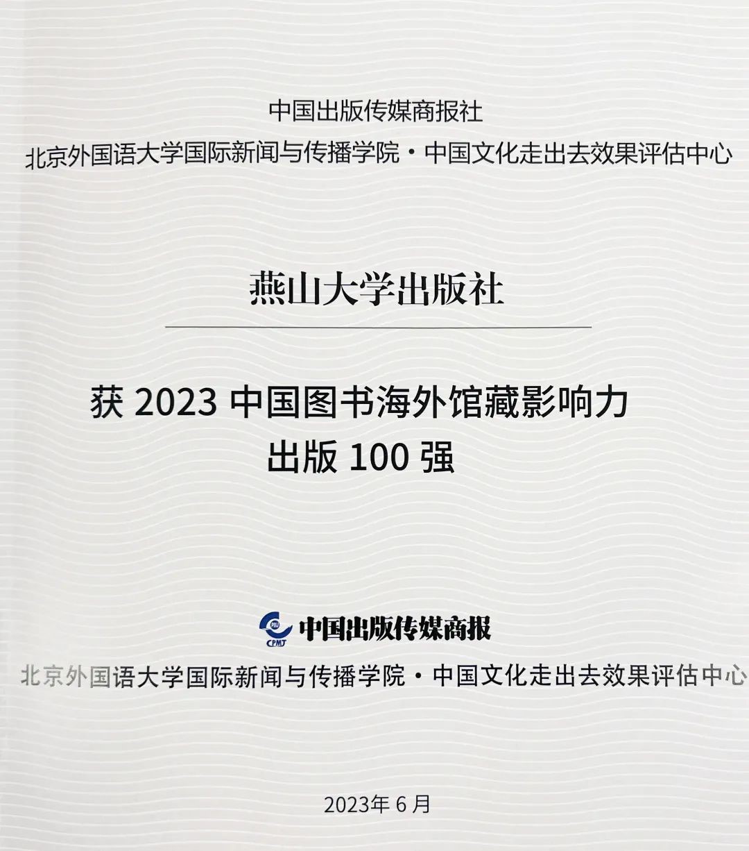 On June 16, the “Research Report on the Overseas Library Collection Influence of Chinese Books for the Year 2023” was officially released at the 29th Beijing International Book Fair. Yanshan University Press has once again been selected as one of the “Top 100 Publishers with Overseas Library Collection Influence in China,” ranking 93rd. This represents an improvement of four places compared to the previous year's ranking in 2022. Yanshan University Press is among the 84 university presses that made it to the list this time.