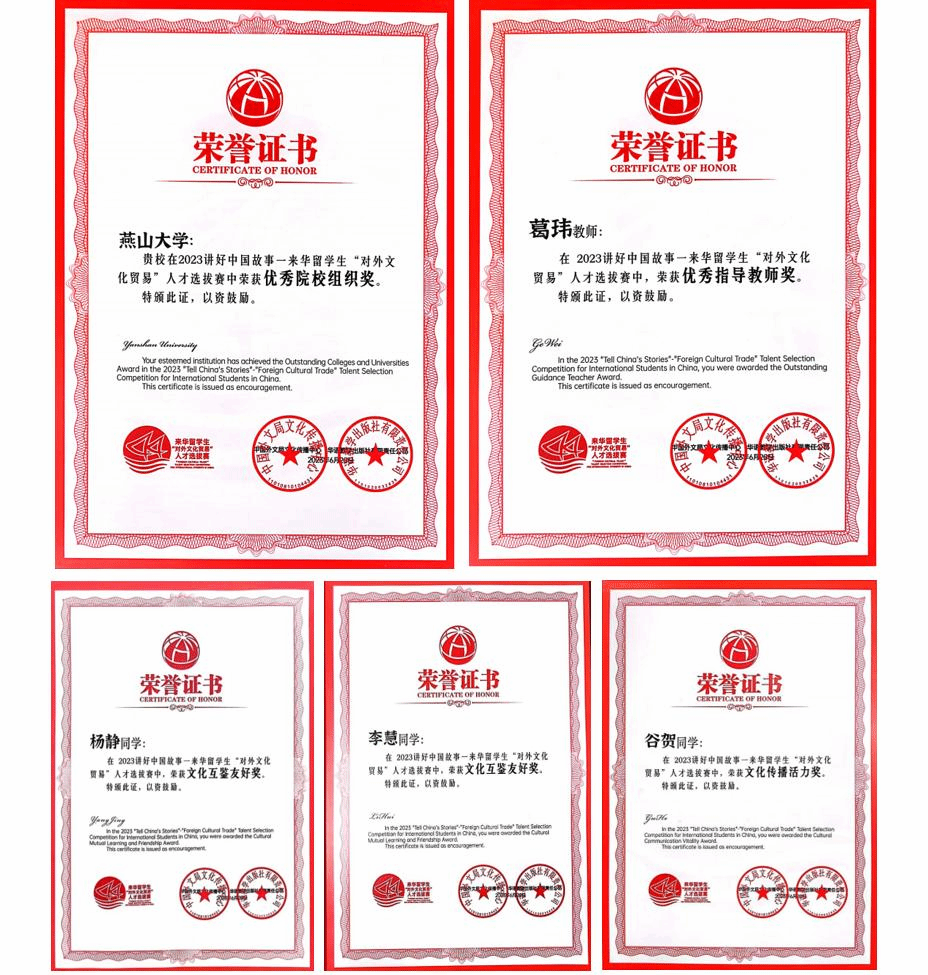The 2023 “Tell China's Story” - “Foreign Cultural Trade” Talent Selection Competition for International Students in China was officially launched in January 2023. It received comprehensive support from numerous Chinese universities and colleges, attracting widespread attention and enthusiastic participation from international students in China. More than 8,000 students from over a hundred countries and more than four hundred universities and colleges eagerly signed up for the competition. After a rigorous evaluation process, YSU has been honored with the Outstanding Colleges and Universities Award; Ge Wei, an instructor from the School of International Education, has been awarded the Outstanding Advisor Award; Yang Jing and Li Hui, students from Turkmenistan, have received the Cultural Mutual Learning and Friendship Award; and Gu He has been honored with the Cultural Communications Vitality Award.