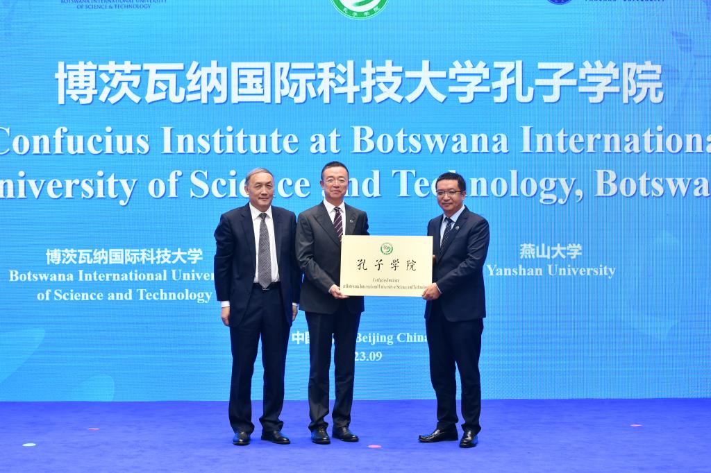 On March 28, 2023,YanshanUniversity formally received approval from the CIEF to jointly establish a Confucius Institute with the Botswana International University of Science and Technology. As the representative Chinese partner institution for the newly established Confucius Institute in 2023,YanshanUniversity was invited to participate in this event.During the event,Yang Wei, President of the CIEF and an academician of the Chinese Academy of Sciences (CAS), officially announced the list of newly established Confucius Institutes for the year 2023. He also presented the plaque for the Confucius Institute at the Botswana International University of Science and Technology toYanshanUniversity and the Botswana International University of Science and Technology.