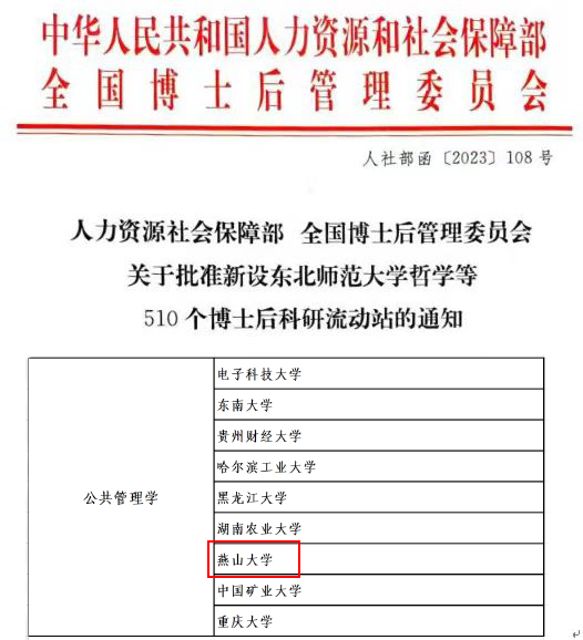 The Ministry of Human Resources and Social Security of the People's Republic of China and the National Postdoctoral Management Committee jointly issued theCircular on Approving the Establishment of 510 Postdoctoral Research Mobile Stations in Philosophy and Other Disciplines at Northeast Normal University, which includes the list of lately approved postdoctoral research mobile stations in 2023. Yanshan University’s Candidate Postdoctoral Research Mobile Station in Public Administration was on the list, meaning the total number of postdoctoral research mobile stations in Yanshan University has increased to 12 and the coverage of subject categories has been further expanded.