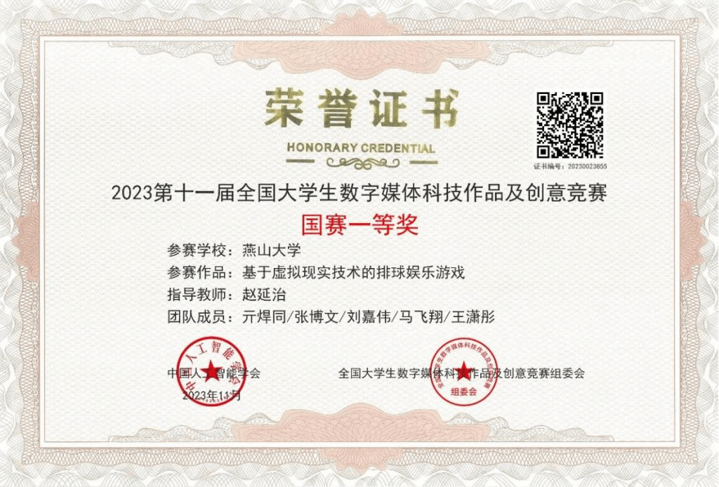 The 11th National College Students Digital Media Technology Works and Creativity Competition 2023 was organized by the Organizing Committee of the Competition and the Chinese Association for Artificial Intelligence, and was included into the College Student Subject Competition Ranking of the 2023 China Association of Higher Education by the Ministry of Education. The competition follows the principle of "technology innovation leading the future, and creativity changing the era" and has attracted contestants from many world-class universities, including Peking University, Tsinghua University, universities in Hong Kong SAR, Macao SAR and Taiwan, as well as overseas universities. The number and quality of works to the competition have been increasing year by year, and the competition has become an important competition for encouraging universities students to seek innovation and entrepreneurship, and improve their practical skills in the integration of technology and art. The Engineering Training Center of Yanshan University has undertaken a series of tasks such as training through university competition, team selection, and competition organization for this competition, and has helped the contestants get good results eventually with the strong support by the Innovation and Entrepreneurship Education and Guidance Center and relevant schools. Looking into the future, the center will, in response to President Xi Jinping’s call on youth innovation, entrepreneurship and creation, unswervingly continue to uphold the principle of educating people through practice and innovation, stick to promote the learning, teaching and innovation by participating in competitions, and constantly improve the YSU students’ capability of innovation and practice.