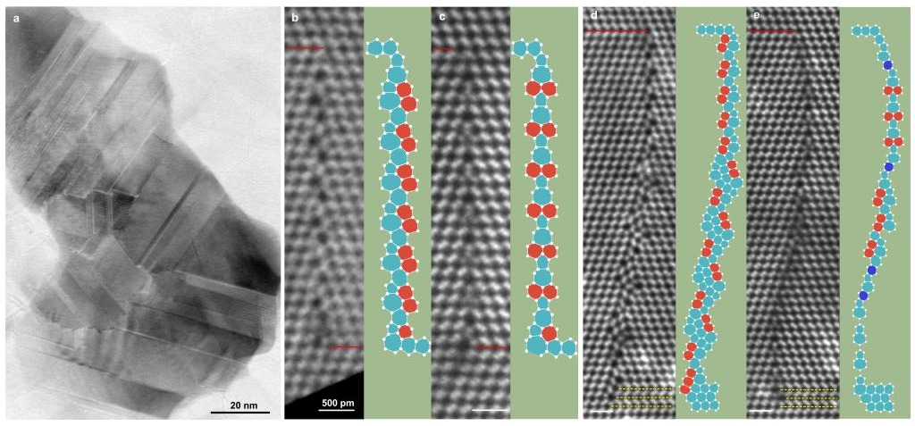 Structural transitionof {112} incoherent twin boundary in nanotwinneddiamond.a:typical grain morphology in nanotwinned diamond; b-e:dislocation-mediated interface structure transition.