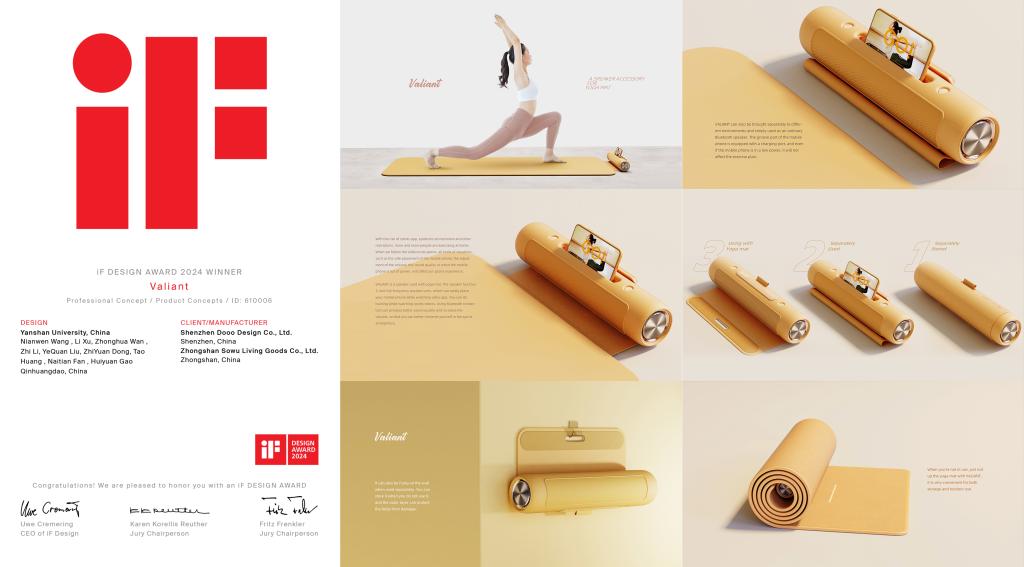 VALIANT Yoga Mat Speaker, designed and developed by the team led by Wang Nianwen from YSU’s School of Arts and Design in conjunction with Shenzhen Dooo Design Co., Ltd. and Zhongshan Sowu Living Goods Co., Ltd., was listed among the winners of German iF Design Award 2024, the top international industrial design award, announced on March 12.