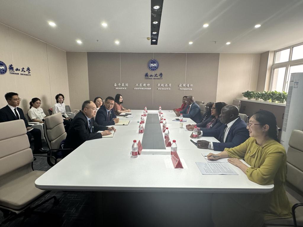 From July 4 to 7, Professor Elisha Shemang, Vice Chancellor of Botswana International University of Science and Technology (BIUST) and Botswana Chair of the Advisory Board of the Confucius Institute at BIUST, led a delegation to visit YSU and participate in the 2024 Annual Advisory Board Meeting of the Confucius Institute at BIUST. Secretary of CPC YSU Committee Zhao Xianfeng and President Zhao Dingxuan met with the delegation respectively. Chen Guoqiang, Vice President and Chinese Chair of the Advisory Board of the Confucius Institute at BIUST, joined the meeting with the delegation and participated in the Annual Advisory Board Meeting.