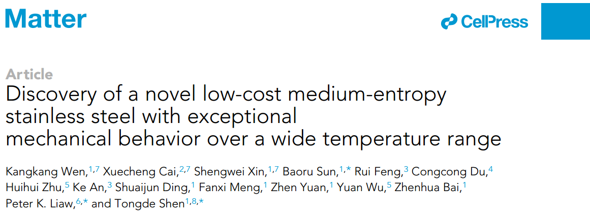 On July 25, a research team led by Professor Shen Tongde from the Clean Nano-Energy Center of the State Key Laboratory of Metastable Materials Science and Technology at YSU published their research findings with domestic and foreign scientists in the online journal Matter (a sister journal to Cell) titled “Discovery of a novel low-cost medium-entropy stainless steel with exceptional mechanical behavior over a wide temperature range”. The journal has an impact factor of 17.3, and the DOI is 10.1016/j.matt.2024.06.041. The full text is available at: http://authors.elsevier.com/c/1jUX69Cyxd6rKM.