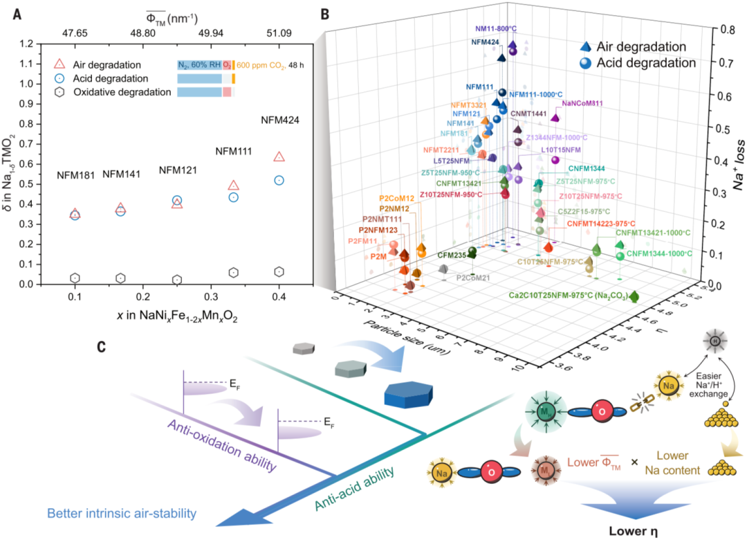 Figure: quantification of acidic and oxidative degradation and the design principles for intrinsically air-stable sodium-ion layered oxides