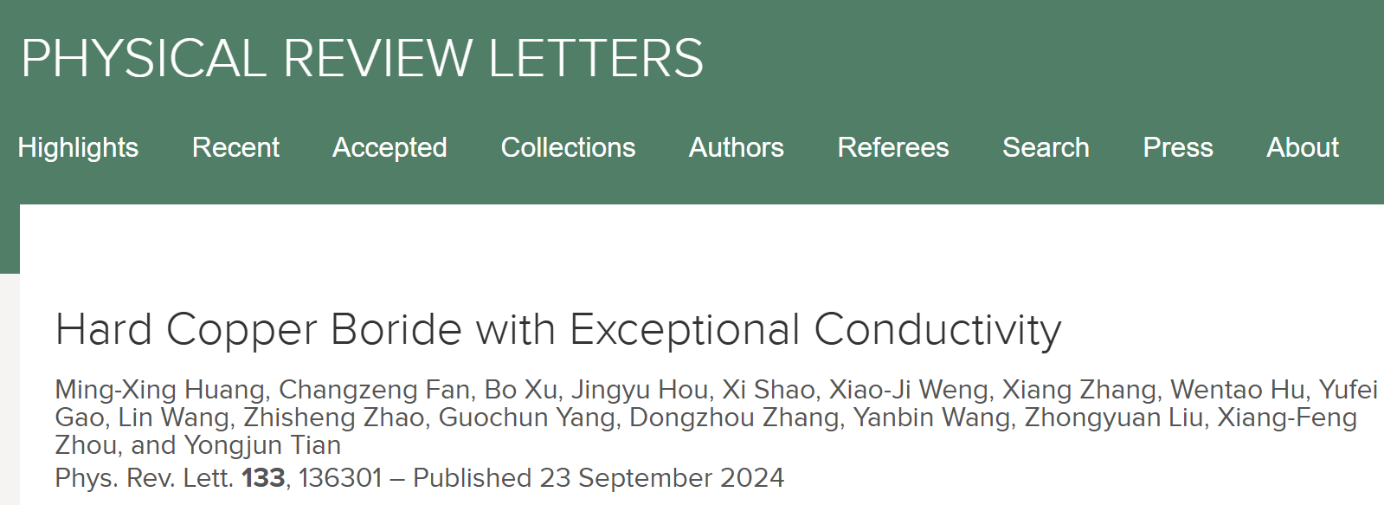 The team led by Academician Tian Yongjun from the Center for High Pressure Science at YSU, in collaboration with researchers at home and abroad, successfully synthesized a new ceramic material composed of copper and boron elements that are immiscible via a high-temperature and high-pressure melting method. The related achievements have been published in the world’s top physics journal Physical Review Letters under the title Hard Copper Boride with Exceptional Conductivity. Link: http://link.aps.org/doi/10.1103/PhysRevLett.133.136301.