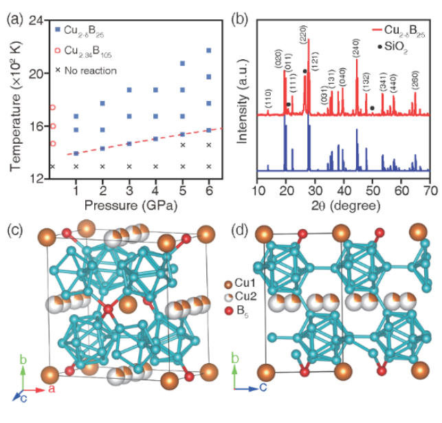 Featuring strong wear resistance, corrosion resistance, high temperature resistance and high hardness, metal borides, a kind of versatile ceramic material, have been widely used in chemical, pharmaceutical, metallurgical, national defense and other sectors. Although boron can react with most metals at high temperature, no reports on Group IB (copper, silver, gold) metal borides have been found. There are only a few reports on the solid solutions of copper (Cu) and boron (B), which are representatives of immiscible elements, for example, CuB~23 and CuB~28. This is because boron has a similar electronegativity with these metals but a quite different atomic radius, making charge transfer between them difficult, and thus no compounds with a precise stoichiometric ratio may be produced. It was not until 2021 that Zhou Xiangfeng, Xu Bo, et al., have successfully synthesized 2D copper-doped boron compounds Cu8B14 for the first time through Molecular Beam Epitaxy (MBE) technique [Fundam. Res. 1, 482 (2021)], proving that copper atoms and boron atoms can form chemical bonds under extreme conditions. Inspired by this, Zhou Xiangfeng, Xu Bo, Tian Yongjun, et al., synthesized and characterized a new 3D copper-doped boron compound Cu1.97B25 under high temperature and high pressure, which was found to be a new ceramic material that possesses both high hardness and exceptional conductivity. It has a measured Vickers hardness of ~27 GPa and a conductivity of up to 105S/m at room temperature, which is the highest conductivity among the B12 icosahedron-based borides. Moreover, Cu1.97B25 reveals a metal-insulator transition under low temperature and normal pressure, or low temperature and high pressure. A p-n conduction type transition occurs at around 30 GPa. Experiments have shown that these are caused by electronic phase transition rather than structural phase transition. Therefore, the novel copper-doped boron compound not only has excellent physical properties at normal pressure, but also exhibits rich quantum behaviors under extreme conditions. Thanks to the exceptional electrical conductivity and the intrinsically low thermal conductivity of the 3D boron grid, promising applications of this material may be expected in the field of thermoelectric conversion.