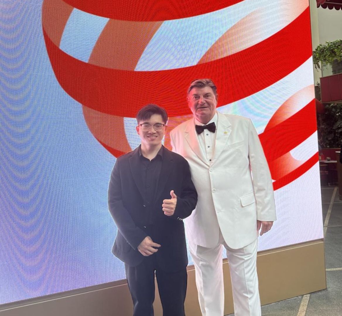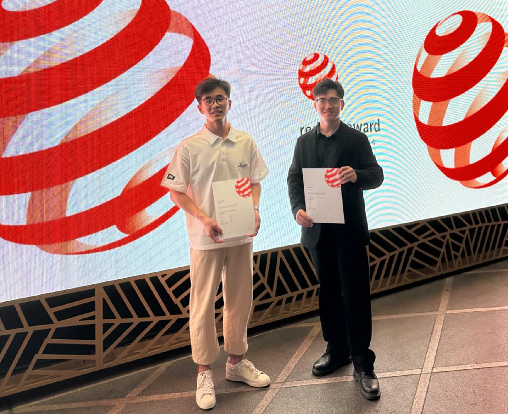 Representatives of the award winners receiving the award in Singapore and taking photos with Peter Zec, founder of the Red Dot Design Award.