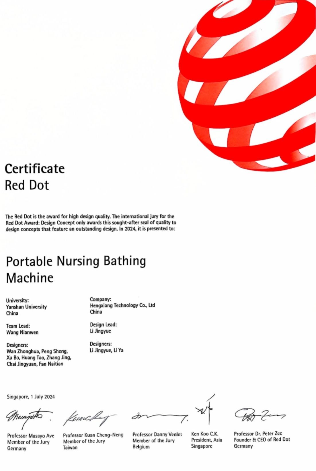 Recently, the results of the 2024 Red Dot Design Award have been officially announced. Two designs created by teams from the YSU School of Arts and Design have been recognized with the prestigious award. Professor Wang Nianwen’s team (including Wan Zhonghua, Xu Bo, etc.) created “Portable Nursing Bathing Machine”, while Professor Liu Weishang's team (including Zuo Sixue and Dong Wenting) created “2023 Beijing Zoo Spring Creative Market”. Both designs stood out from over 10,000 entries from more than 60 countries and regions worldwide for their unique design and exceptional visual presentation, earning the Red Dot Design Award for this year.