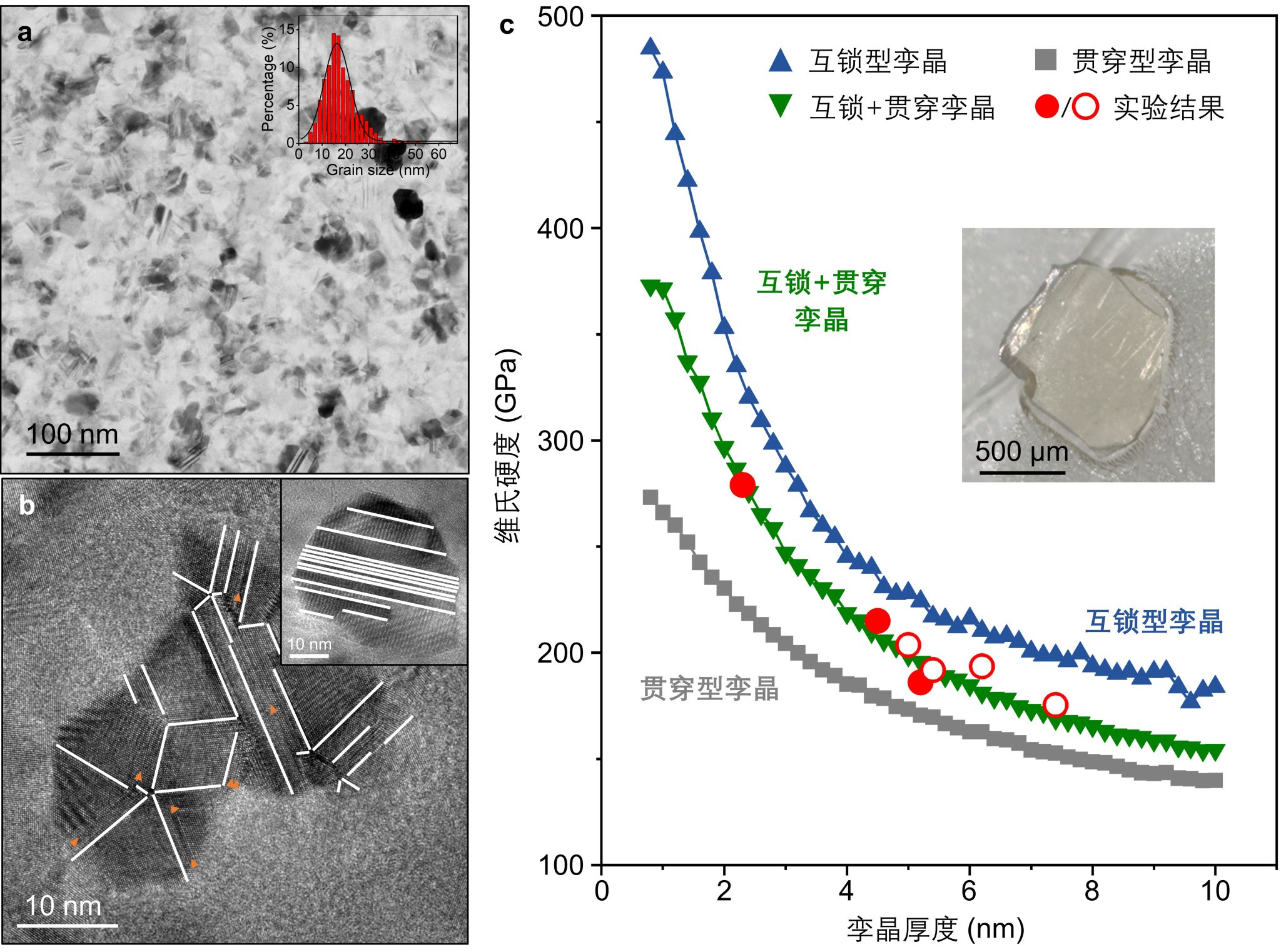 Legend: The microstructure and Vickers hardness of ultrafine nanotwinned diamond. a) The bright-field STEM image shows the sample’s overall microstructure. The inset shows the grain size distribution obtained through statistical analysis, with an average grain size of 18 nm. b) The high-resolution TEM image highlights the characteristic twin structures within the sample: the main image shows predominant interlocked twins, while the inset shows penetrating twins observed in localized areas. c) The figure shows the variation in hardness with twin thickness calculated based on the dislocation model, alongside hardness data obtained in experiments. The inset provides an optical photograph of the ultrafine nanotwinned diamond sample.