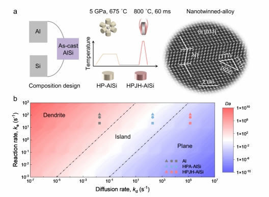 Illustration: a) Schematic diagram of the preparation process of different Al-Si alloys. The right side shows the HRTEM image of nanotwinned-Si in HPJH-AlSi alloy, revealing the characteristic twinned structure in the sample. b) Relationship between the deposition morphology phase diagram and the nondimensional electrochemical Damköhler number.