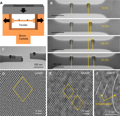 Figure 2: In situ tensile deformation process of B4C nanobeams and high-resolution STEM characterization of the plastic deformation zones