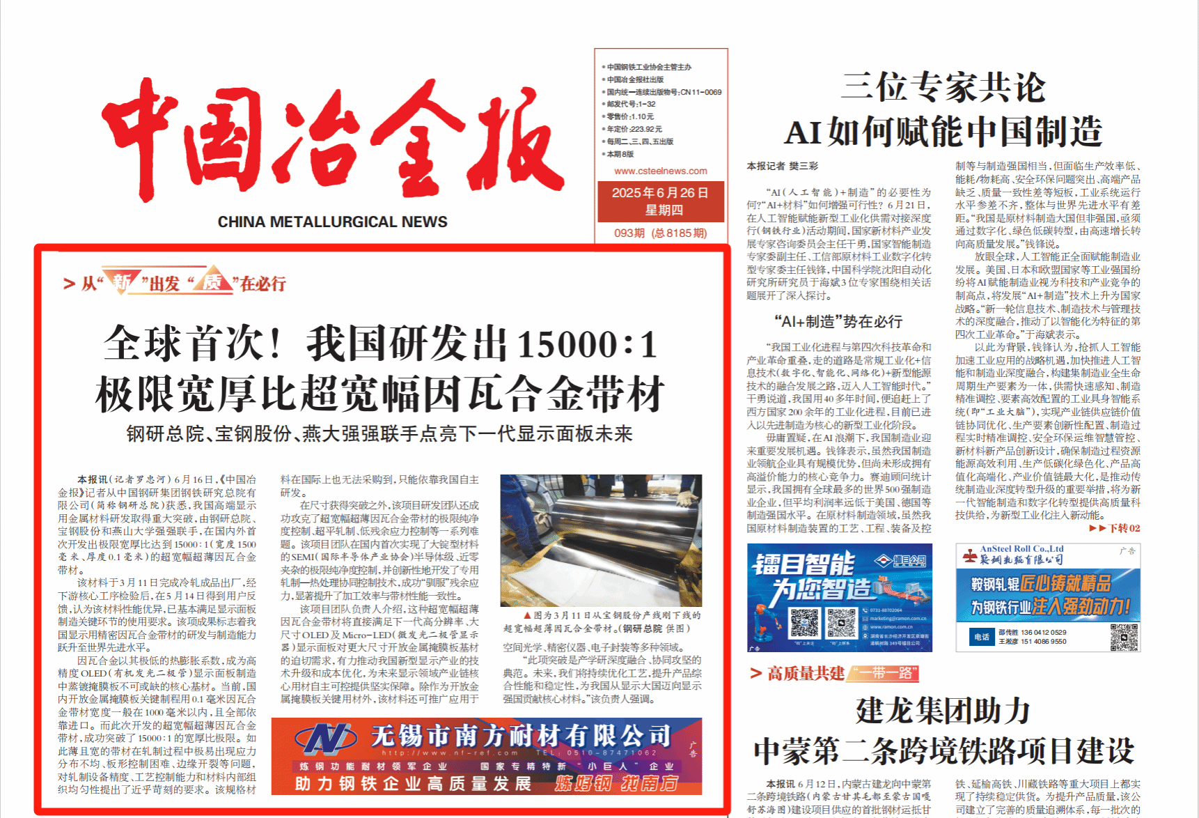 The Invar steel product is the world's first ultra-thin Invar alloy strip with an extreme width-to-thickness ratio of 15,000:1 (1500 mm × 0.1 mm), jointly developed by YSU, China Iron & Steel Research Institute Group Co., Ltd. (CISRI), and Baosteel. Based on the results of mass production validation by downstream enterprises, its performance has fully met world-leading standards.