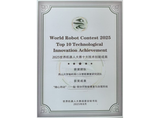 YSU's BCIR Team, leveraging its self-developed wearable rehabilitation robotic hand, initiated and established a specialized competition titled "BCI-Based Cooperative Control for Rehabilitation Robotic Hands" that centers on the BCI technology. The team was honored with the "Outstanding Organization Award" by the Organizing Committee of the World Robot Contest. The technical competition attracted attention and participation from 15 institutions, including Beihang University, Beijing Normal University, and the University of Macau. It has established a high-level platform to advance the development of clinical intelligent rehabilitation and foster technical exchange in the field of BCI. The team's self-developed "Mind in Motion: A Brain-Limb Synergistic Intelligent Rehabilitation and Self-Care System" was presented as a roadshow project at the World Robot Contest and received the "Top Ten Technological Innovation Achievement" award. The system creatively accomplishes real-time collaborative control between the EEG signal-based intention decoding and physical limb movements, earning high praise from competition judge Professor Gao Xiaorong of Tsinghua University for its cutting-edge technical concept and broad application prospects.