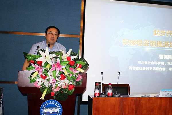 Baogang Cao, member of Party Committee and Assistant Dean of Hebei Academy of Social Sciences, and Vice President of Hebei Province Federation of Social Science Circles is giving a keynote speech