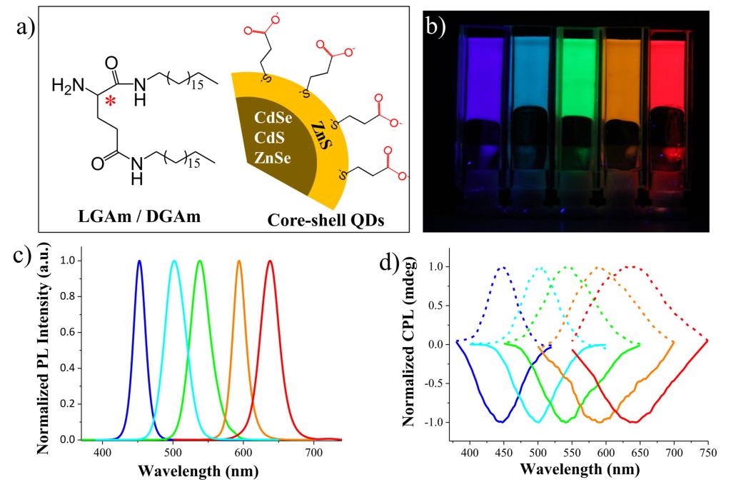 Figure1. a)Molecular structure of the gels and the QDs;b)Photograph of various QD doped co-gels in different colors under UV light; c) Fluorescence spectra of the corresponding co-gels; d) Mirror-image CPL spectra of the corresponding co-gels.