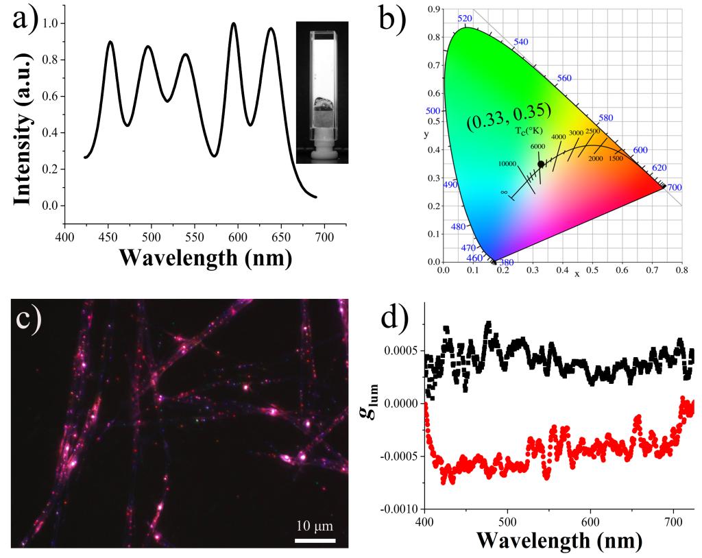 Figure2. a)Fluorescence spectra of the white-light-emitting co-gel. Inset: Photograph of the gel under UVirradiation; b) Commission Internationale de I’Éclairage (CIE) coordinate value of the white-light-emitting co-gel; c) Fluorescence microscopy image of the white-light-emitting co-gel; d) CPL dissymmetry factor glum as a function of the reported.
