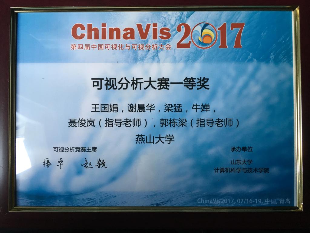 [News from News Center] Recently, the 4thChina Visualization Conference (ChinaVis2017) was held in Qingdao, Shandong Province. Guided by Junlan Nie and Dongliang Guo, teachers of School Information Science and Engineering, YSU team consisting of Master Degree candidates Guojuan Wang and Chenhua Xie stood out from 68 teams all over China, and tied for the first prize with teams from Tianjin University and Northeastern University in Data Challenge segment. This is the second time YSU has won the highest honor after YSU won the first prize in ChinaVis2016.
