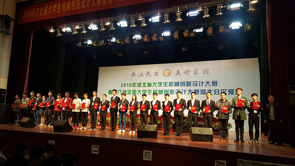 [News from the News Center] On April 21th and 22th, the 2018 College Students Mechanical Design Innovation Competition of Hebei Province, also the 8th National College Student Mechanical Innovation Design Competition Hebei Province Division preliminary was held at Shijiazhuang Tiedao University. The competition featured 231 competition entries from 38 universities including YSU, Hebei University of Technology (HBT), Hebei University of Science & Technology (HBST) etc. Liren College of YSU sent 9 teams of 27 people to participate in this competition. Finally, two designs won special awards, two designs first awards, three designs the second awards, one design the third award and one design won good award. Among these, two projects, Cycling bicycle parking device and Vertical bicycle parking rack which won the special awards, will participate in the national finals.