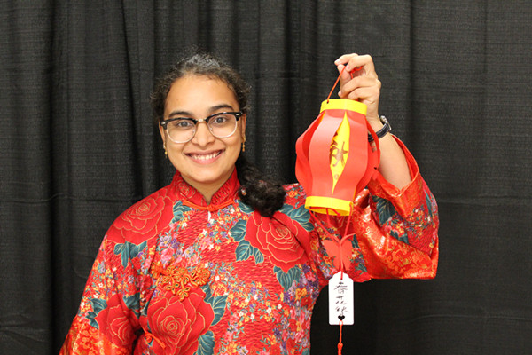 A student wearing Chinese traditional dress is holding a lantern for photo.