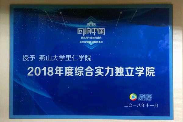 Liren College has been selected in the “Resounding China” Tencent Network Education Annual General Ratings Award for many years. This is the recognition of Liren College’s performance in education. As the vice chairman unit of the National Independent College Collaboration Association and the chairman of the Board of Directors of the Independent College of Hebei Province, Liren College has consistently ranked top ten in independent college in terms of the comprehensive strength in education for many years. Relying on the quality education resources of Yanshan University, Liren College, in light of OBE’s new concept and guidelines of CDIO project, focuses on the education in innovative entrepreneurship and social responsibility and deepen the teaching reform, strengthen the professional foundation, highlight the professional characteristics, attach attention to the cultivation of students' practice and innovation ability, and continuously improve the teaching quality. The quality of graduates and the comprehensive strength of the college have been effectively promoted.