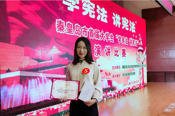 [News from the News Center] On the afternoon of December 13, Qinhuangdao City’s “Constitution Learning” Speech Contest was held at Hebei Normal University of Science and Technology. 13 players from 8 universities in QHD participated in the competition. After the competition, the two players, Tian Jiahao and Tian Ran, won the second prize and 7thprize respectively.