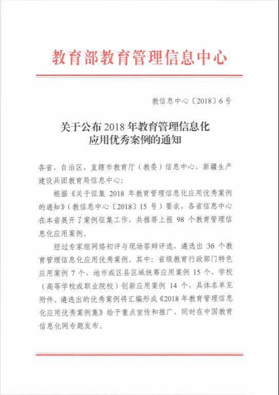 In this selection, the information centers of each province recommended 98 cases of education management digitalization. After the online evaluation by expert committee and on-site oral examination, 36 outstanding cases were selected, with 7 characteristiccases from provincial education administration departments, 14 overall cases from municipalities, districts and counties, and 14 innovative cases from schools (higher schools or vocational colleges). The Education Management Information Center of the Ministry of Education will compile the outstanding cases and give priority to publicity and promotion.