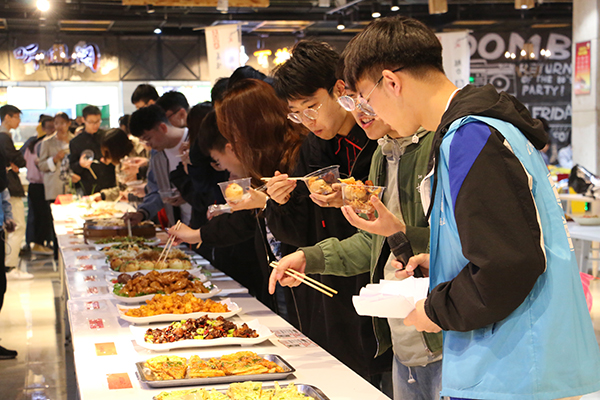 The competition has not yet officially started, there have been multitude of students waiting and looking forward to trying the food. Under the fine craftsmanship of the canteen masters, the food in the competition attracted students. The fried chicken seemed crispy and tender, the roast duck is ruddy, fat but not greasy; the Dongpo pork leg is soft smell nice; the phoenix shrimp is thick and crispy; glutinous rice and fruit complements each other in the glutinous rice fruit dish. After an hour of tasting, the students finished all their food to prove their love for the food festival.