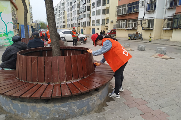 At 9:30 on the morning of April 27, the volunteers arrived at their respective areas as planned and cleaned up the areas: scrubbing the bulletin board, cleaning the seats, picking up the road waste. After more than two hours hard work, the public facilities in the community have been completely cleaned. The plastic bags, waste paper, cigarette butts and other garbage have been basically cleaned up. The orange-red volunteer vest forms a beautiful landscape in the community.