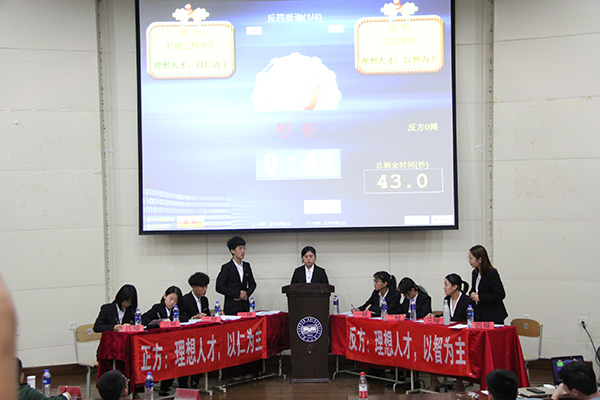 After several levels of selection, the debate teams from the School ofMechanical Engineering and the School of Humanities and Law competed for the championship.The debate between the two sides is closely related to the debate --Does the Ideal Talent Benevolence-oriented or Intelligence-oriented? Both teams had provided their points and arguments and supporting evidence, which madethe debate interesting and attractive.