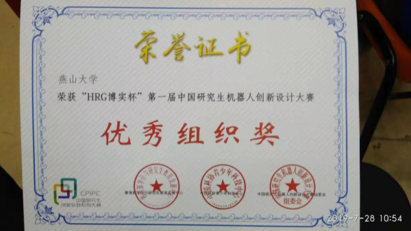 [News from the News Center] From July 27 to 28, the final of the “HRG Bosch Cup” China Graduate Robot Innovation Design Competition was held at Harbin Institute of Technology. After two days of fierce competition, the three postgraduate graduates competing with 160 finalists from 96 universities and won prizes. The project “Yanda Eagles” “a new 3-DOF parallel motion simulator” (team members: Song Jingke, Yin Tao, Gao Min, Zhao Kun, Guo Yu, instructor: Chen Ziming) won the first prize of the software simulation group, "the Finder team’s "One-stop based on the six-degree-of-freedom parallel mechanism Unmanned aerial vehicle integrated management platform" (team members: Shao Kexin, Tian Yusheng, Tian Kejian, Zhang Jingyao, Wang Yameng, instructor: Feng Zongqiang) won the second prize of the creative design group, The five-degree-of-freedom hybrid robot innovation team’s “The five-degree-of-freedom hybrid processing robot for materials” (team members: Xu Zhenghe, Mei Youen, Yang Fan, Wang Chao, instructor: Xu Yundou) won the second prize of the physical display group, and YSU won the award for outstanding organization.