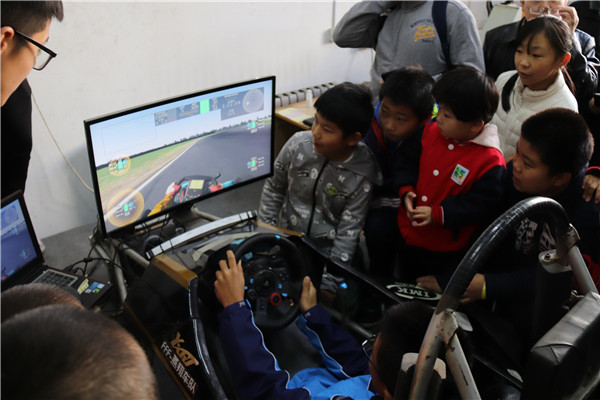 In the studio, more than 80 children watched the video of “FSC” and Yanxiang Racing Team. The video introduced the development process of the car and the achievements of the previous generations. Afterwards, the children were interested in driving the simulation car. The driving simulator was transformed and processed by the team members on the basis of “Yanxiang No.5”, which made the children feel the racing experience and the game situation more realistically.
