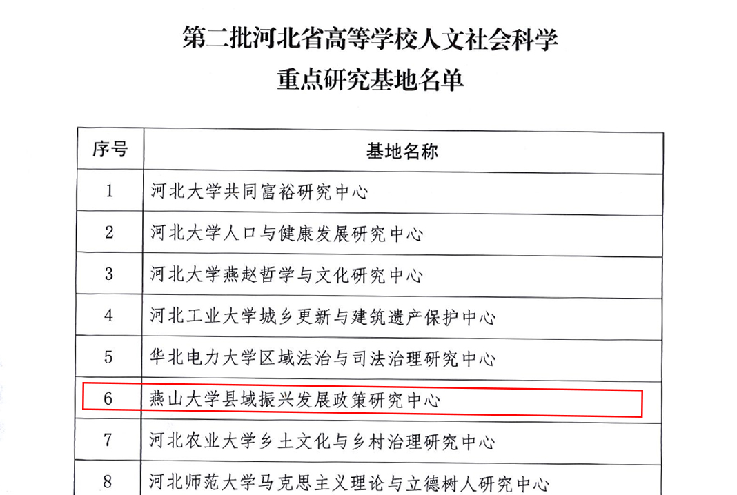 Recently, Education Department and Finance Department of Hebei Province issued the Notice of Education Department and Finance Department of Hebei Province on Publishing the List of the Second Batch of Key Research Bases for Humanities and Social Sciences in Colleges and Universities of Hebei Province (JJK [2022] No.5), and the "County Revitalization and Development Policy Research Center of YSU" was approved for initiation.