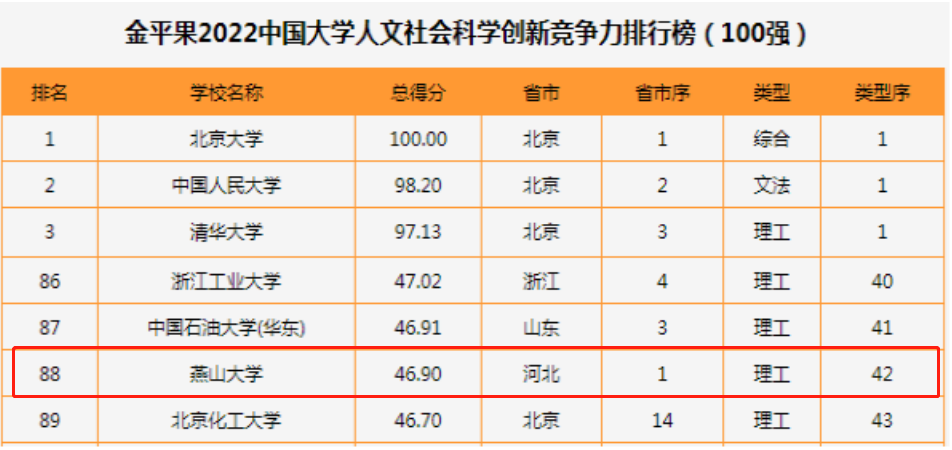 Recently, the Golden Apple Ranking released the 2022 list of the top 100 Chinese universities with innovation competitiveness in humanities & social sciences. Yanshan University ranked 88th. Yanshan University first entered the list in 2021. It's the only university that entered the 2022 list in Hebei Province.