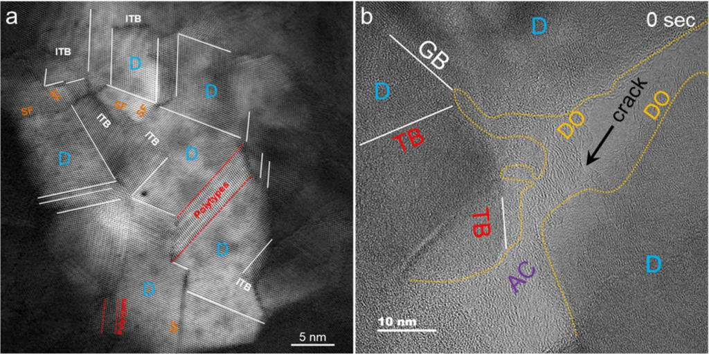 In 2020, YSU, in collaboration with Beihang University and other partner institutions, jointly proposed an innovative method for toughening diamonds. Through multi-level structural modulation, they successfully synthesized a diamond composite material. This material is assembled from the bottom up and consists of coherently aligned diamond polytypes, intertwined 3C diamond nanotwinned crystals, and interlocking diamond nanocrystals. Through this innovative microstructure design, the material, while maintaining a hardness of 200 GPa, benefits from the synergistic effects of nanotwinned crystal toughening, laminated composite toughening, and phase transformation toughening. As a result, the fracture toughness of the diamond material has been increased to 26.6 MPa × m0.5, approximately five times that of synthetic diamond, surpassing magnesium alloys, and comparable to aluminum alloys. This achievement was published in Nature in 2020 (Nature 2020, 582, 370-374). During the characterization of the fracture toughness of the nanotwinned diamond composite material, researchers observed, for the first time, the phenomenon of crack self-healing within the test samples.
